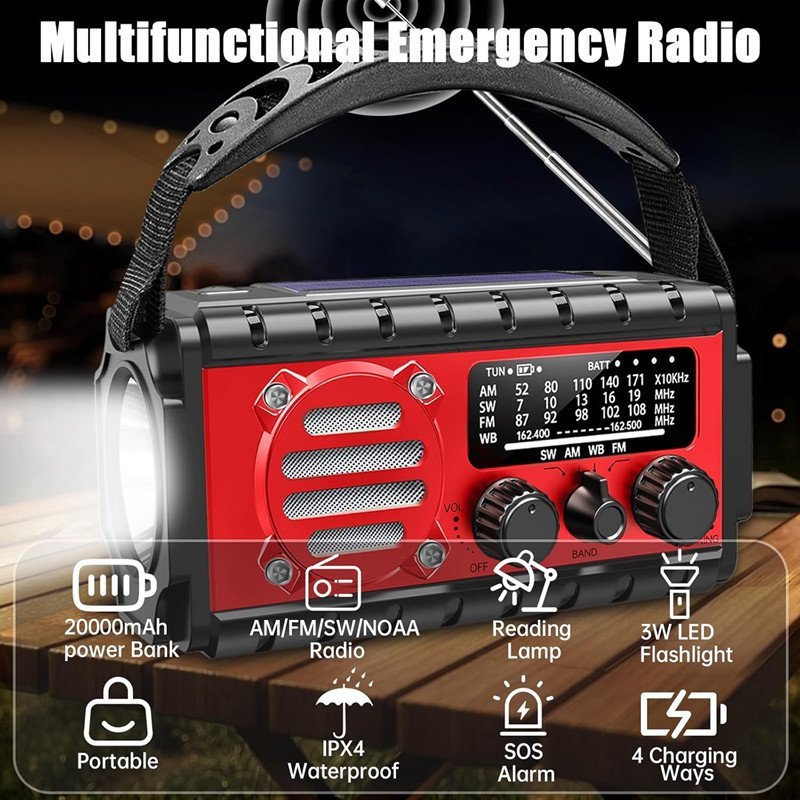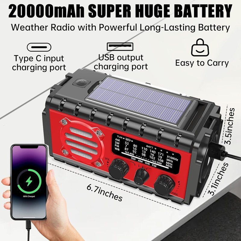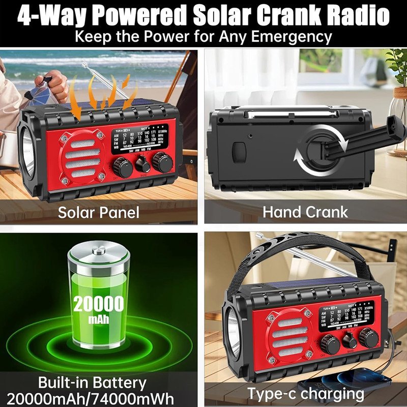 [20000mAh Emergency Power Bank ] 72-Hour Survival Charging Station--Industry-leading 20000mAh polymer battery charges an iPhone 14 Pro 5 times or powers the radio for 48+ hours. Triple charging options: solar panel, hand crank, and Type-C fast charging. 5 minutes of cranking = 30 minutes of emergency calls. 4-level power indicator + digital display ensures energy control during blackouts.